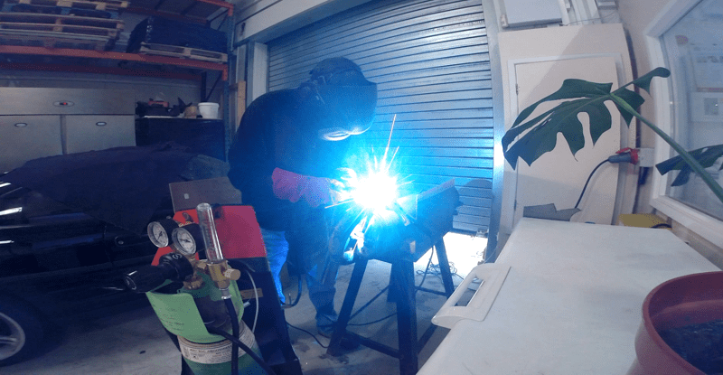 An action shot of welding the exhaust flange and photobombing by a cheese plant!